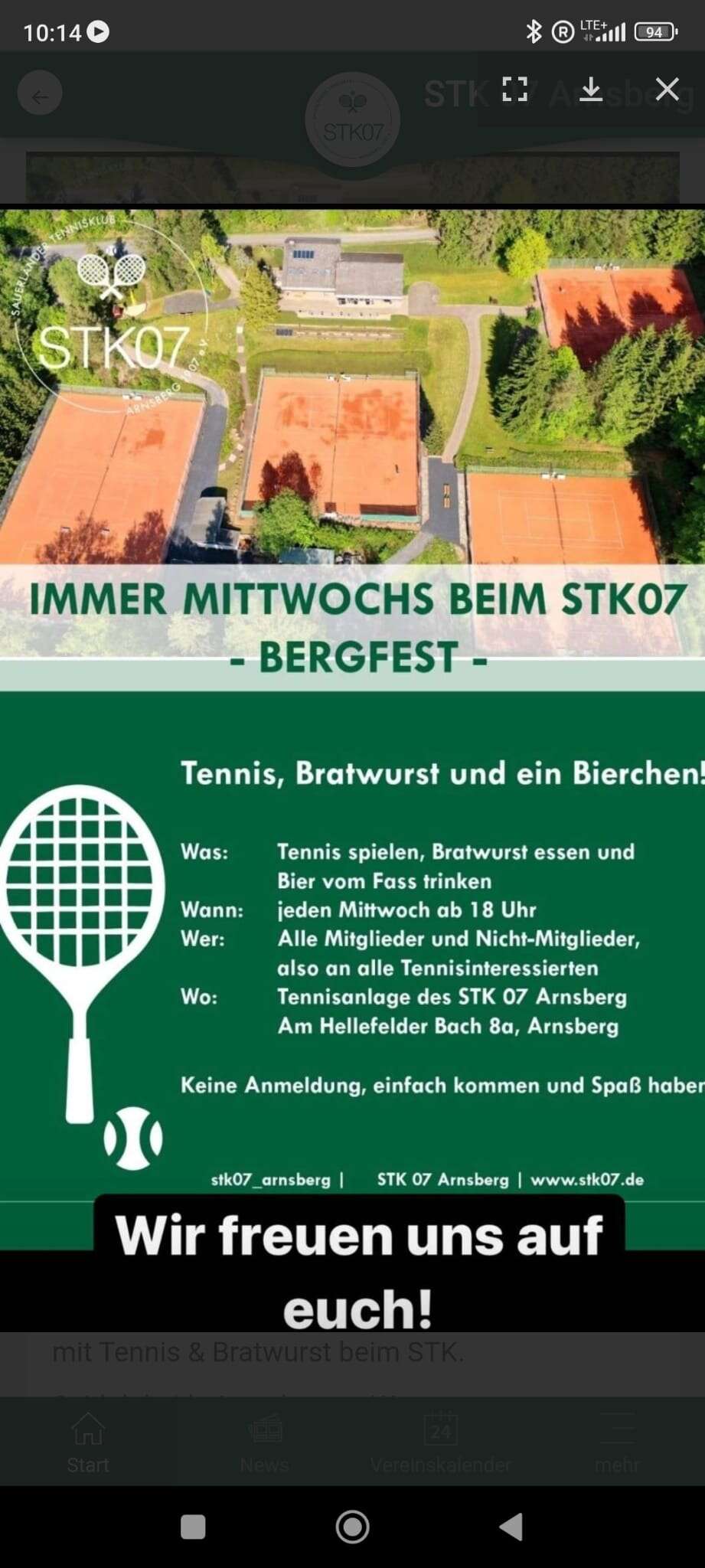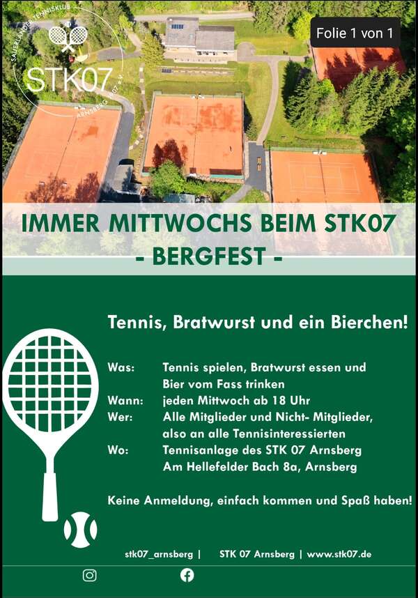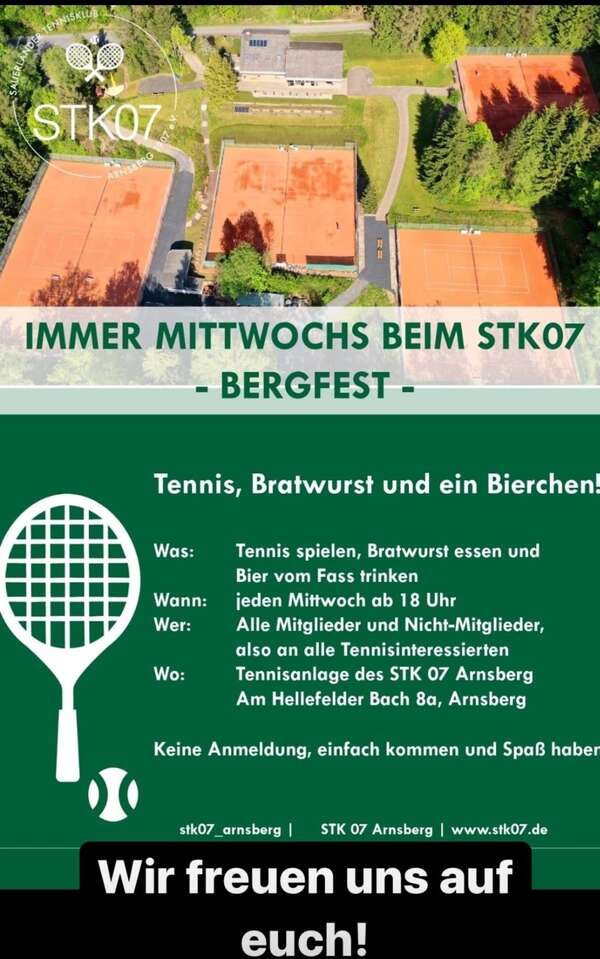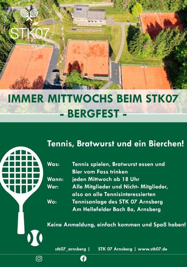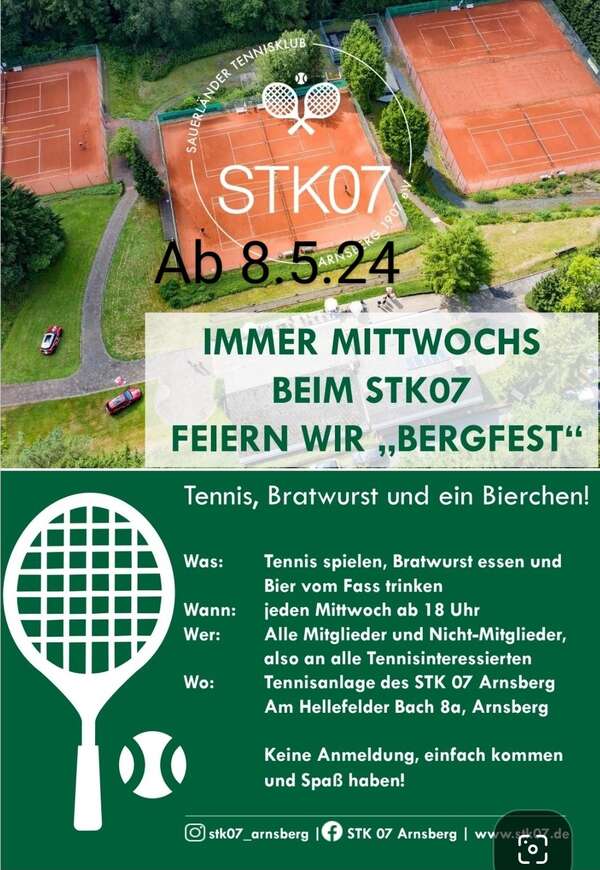 Am 10.5.23 ab 18:00 heißt es wieder "Bergfest" mit Tennis & Bratwurst beim STK.