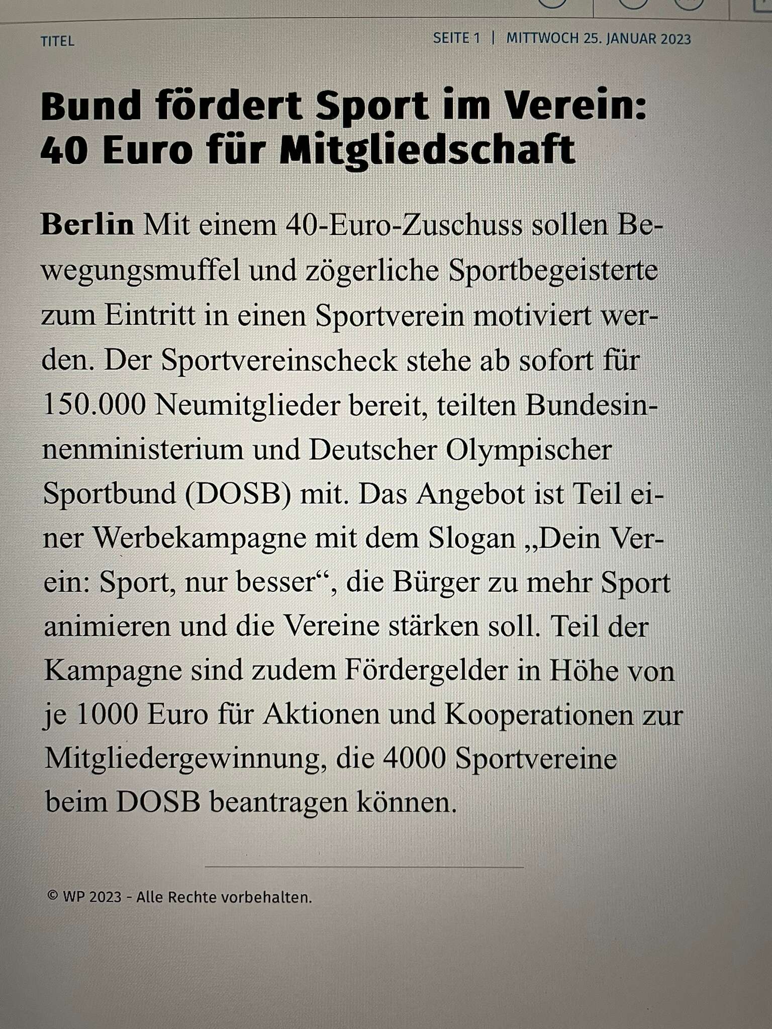 Eine gute Sache bietet der DOSB auch für Interessierte des STK an. Der DOSB fördert mit 40 € den Eintritt in einen Sportverein.