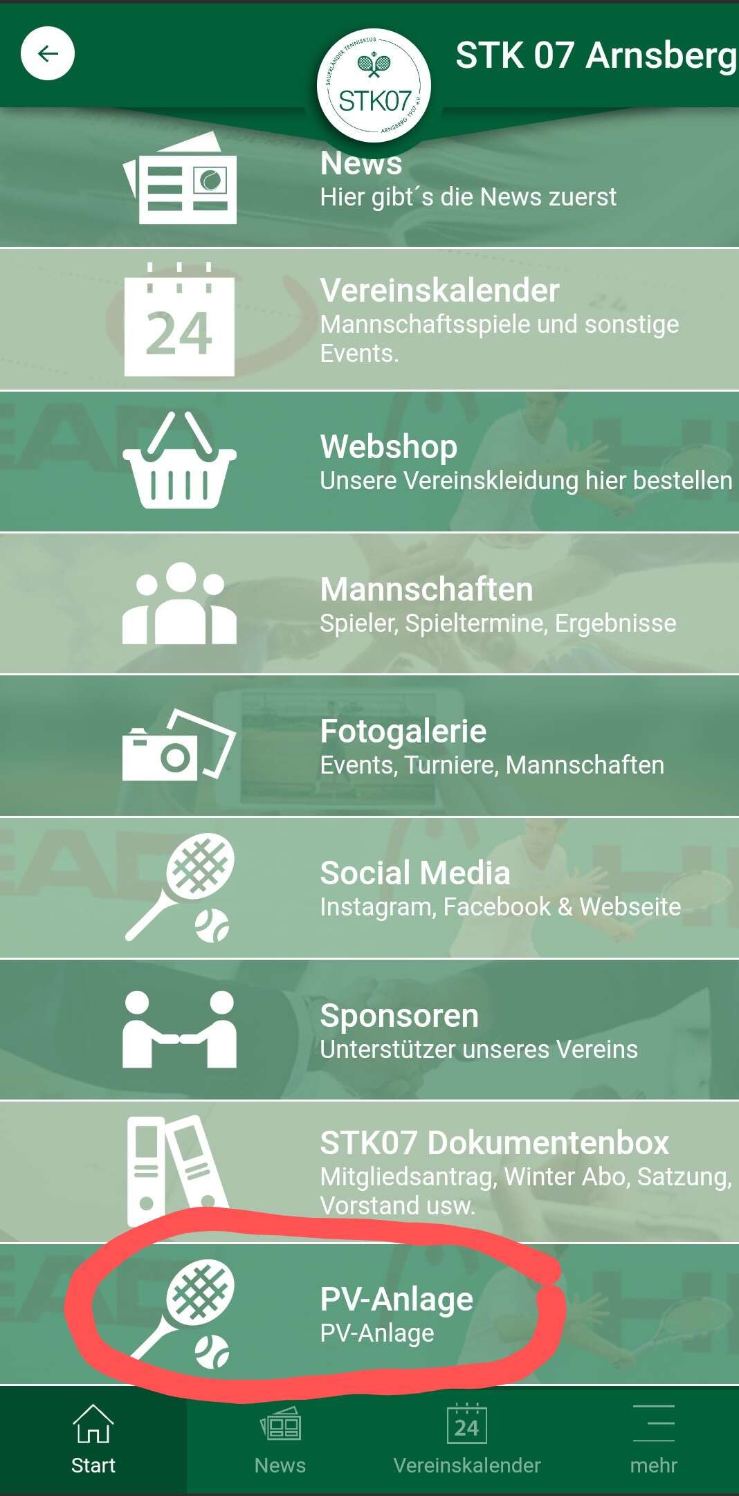 Unter dem neuen Button "PV- Anlage" s. Foto könnt ihr euch selbst einen Überblick über die ökologische Stromerzeugung beim STK mit einem Klick anschauen.