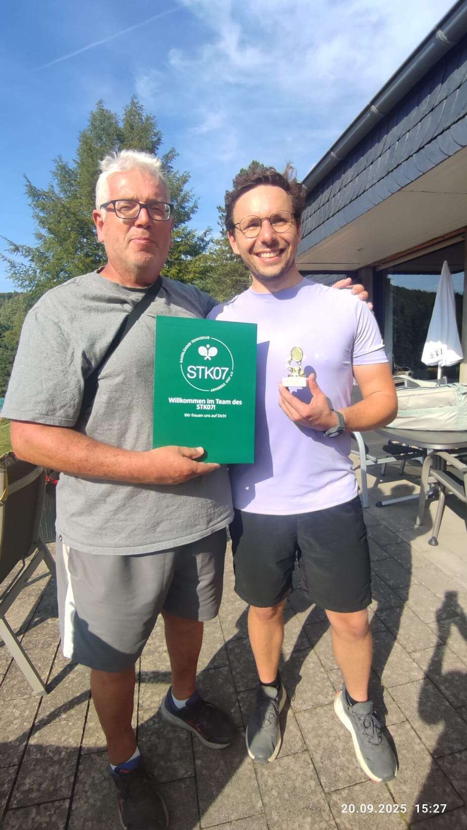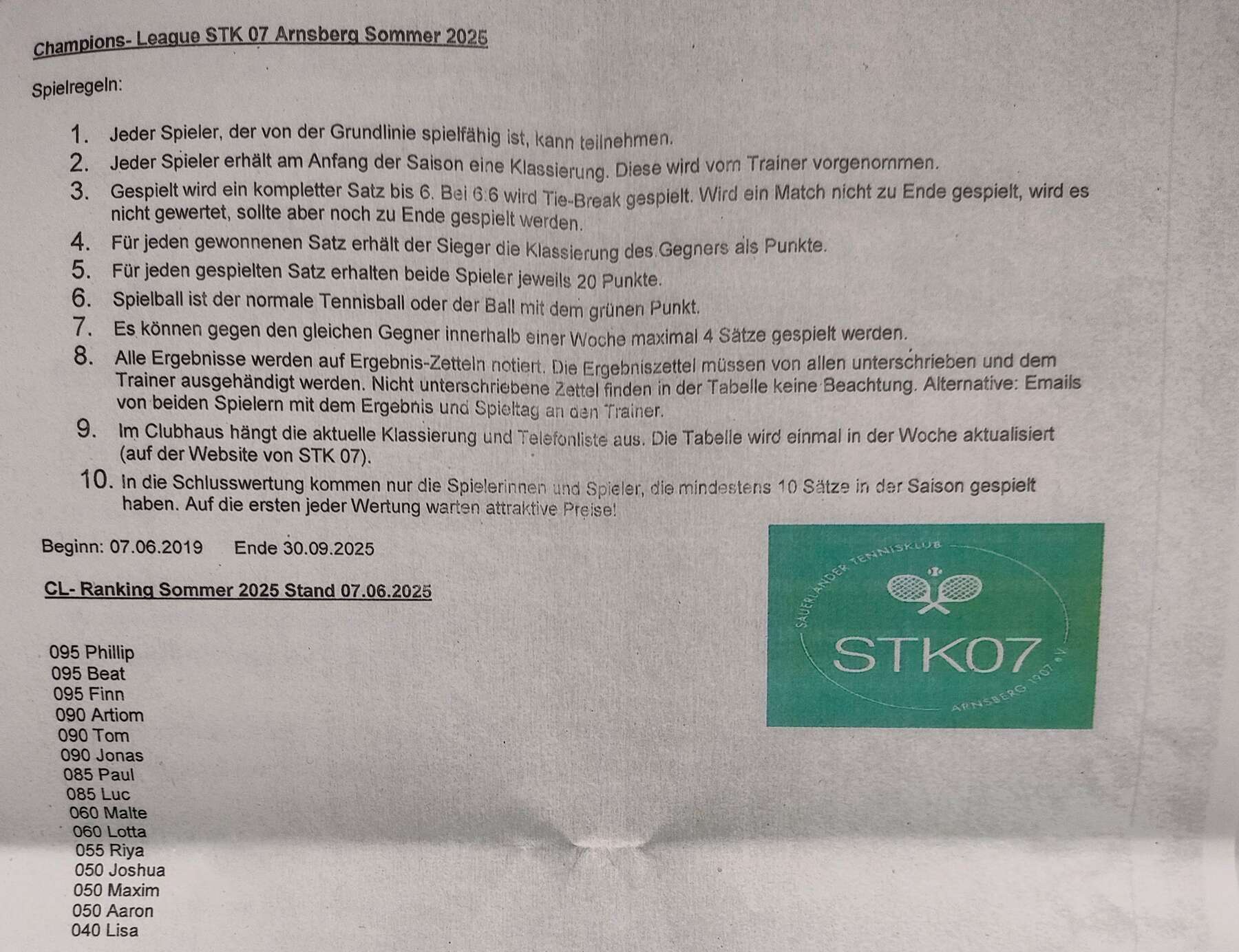 Von Anfang Mai bis Ende September 2025 haben zahlreiche Jugendliche des STK 07 an der vom ClubtrainerJoachim Graef ausgerichteten Champions-League teilgenommen, bei der alle Teilnehmer/innen für jeden gespielten Satz Punkte erzielen konnten.Die Sieger/innen haben dazu noch Extrapunkte erreichen können. Am Ende lag Philipp vor Tom und Jonas. Auch auf dem Foto Luc, Paul und Artiom.
