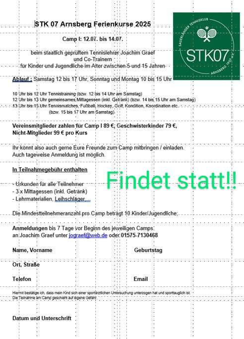Von Samstag 12.7 bis Montag 14.7 findet das geplante STK- Tennis- Feriencamp statt.