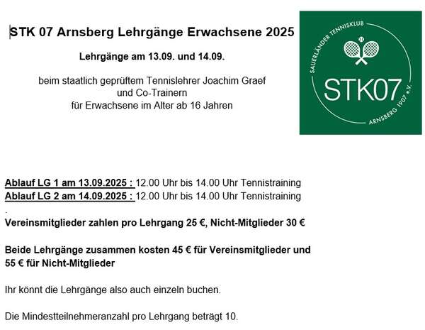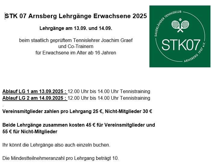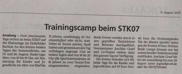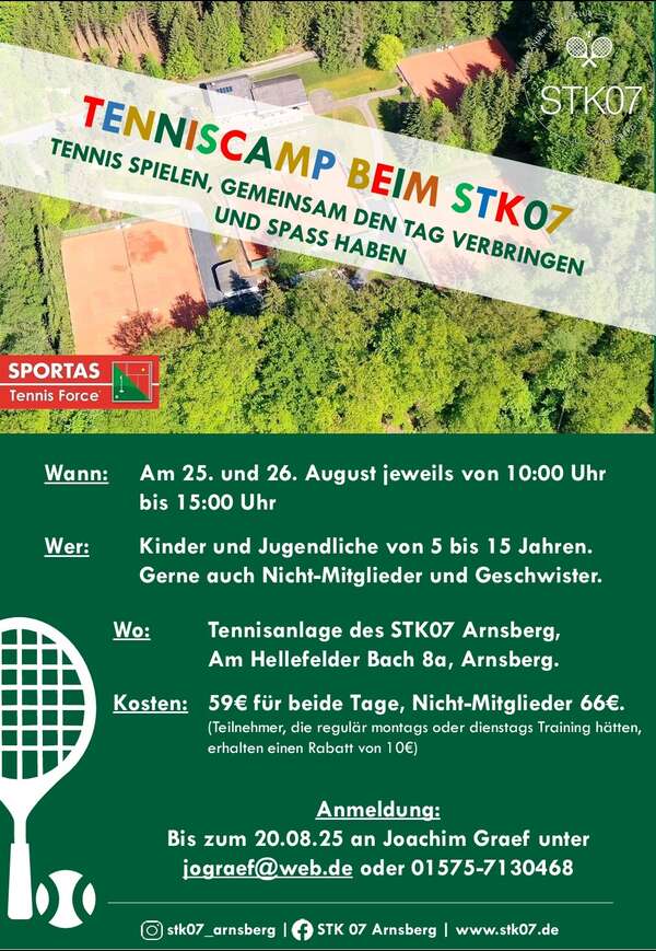 Unter der Leitung unseres Trainers Joachim Graef findet am 25./26.08 ein weiteres Tenniscamp für Kinder und Jugendliche (jeweils 10 – 15 Uhr), sowie ein erstes Tenniscamp für Erwachsene (von 18-20 Uhr) statt.